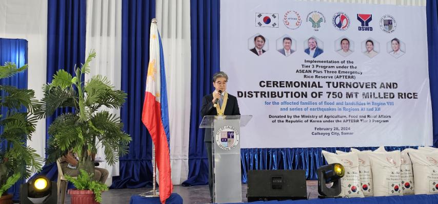 Deputy Chief Minister Sang Seung Man graced the Ceremonial Handover of 750MT of rice donated by the Republic of Korea to the Philippines on 28 February. The event, held in the city of Calbayog in Samar, marked a significant gesture of solidarity and support.